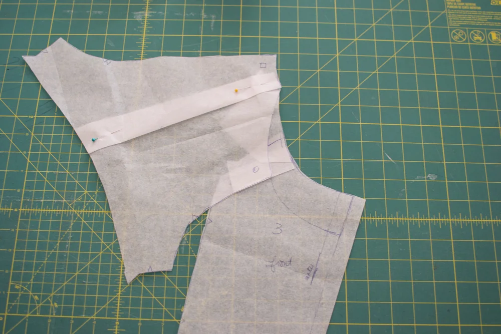 I started by making the next size down (a Medium). But I still wanted my neckline to be higher and more modest than the design, so I taped the front and sleeve together where they would be sewn (overlapped by 1 1/4” – two seam allowances) and re-drew the neckline. This is a raglan sleeve that is part of the neckline. If this top had a set in sleeve, I would only have to adjust the front.