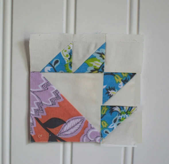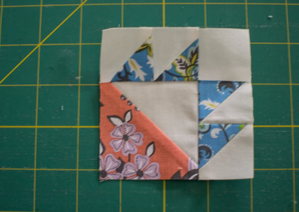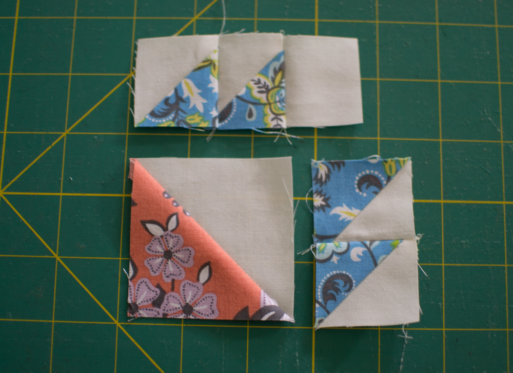 Speaking in terms of finished sizes, the small HSTs are 1/3 of the final block and the large HST is 2/3 of the finished block. Since I wanted to make a 3” block, I needed four 1” HSTs and one 2” HST.
