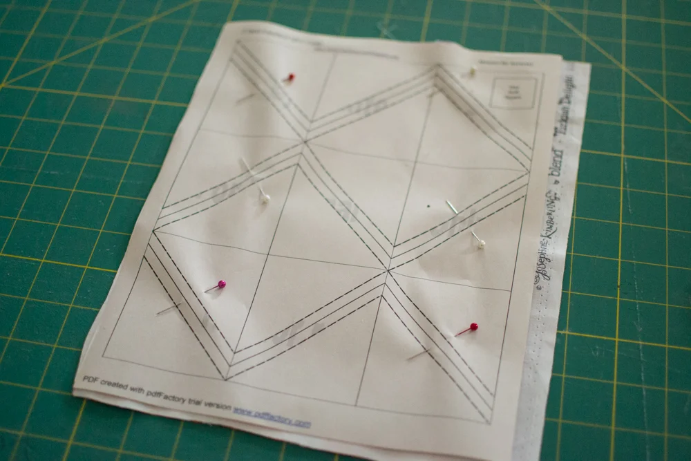 To use this method, cut two pieces of fabric the same size as the paper and place them right sides together. Pin the paper on top.