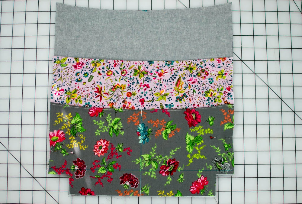 Align the bottom of the upper pocket piece (the pink one) with the tops of the squares cut out of the lower (gray) pocket piece. Pin these pieces together along the side edges.