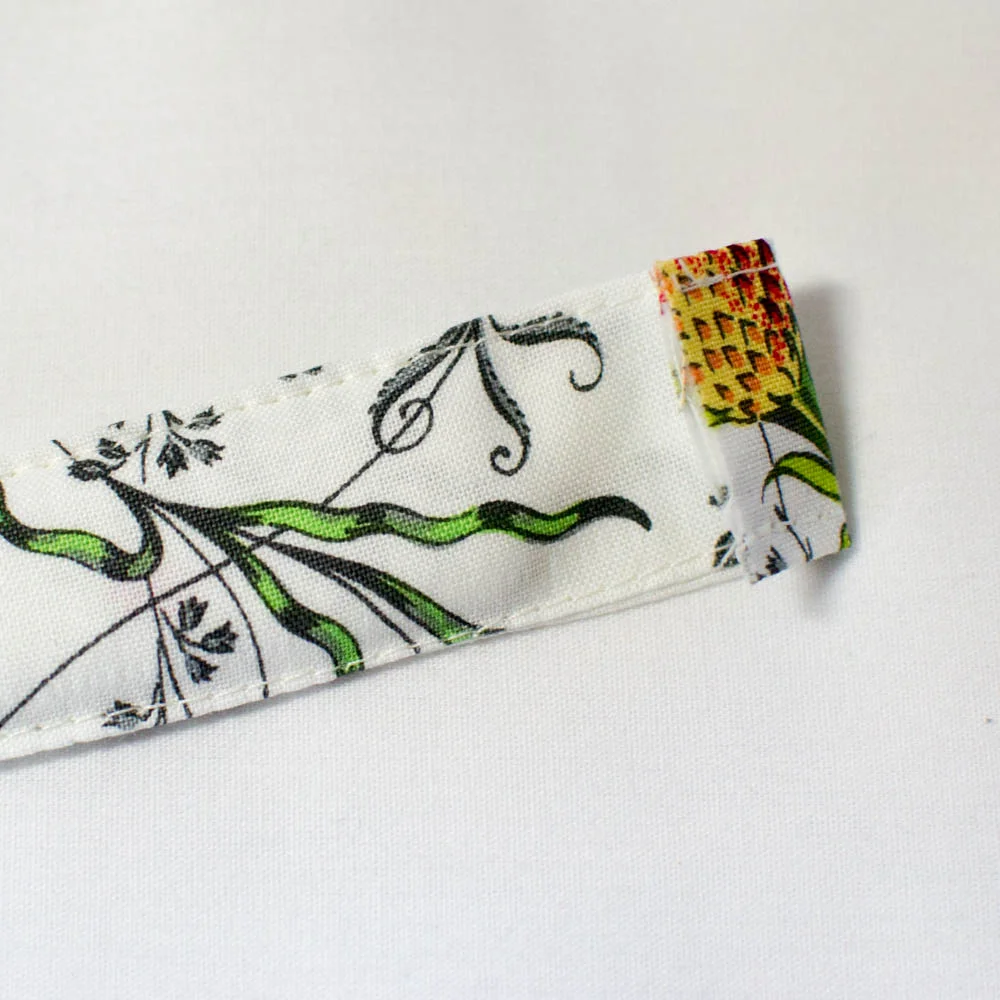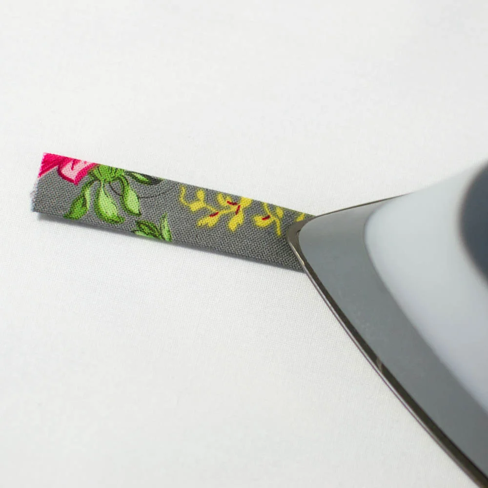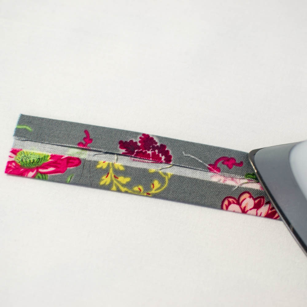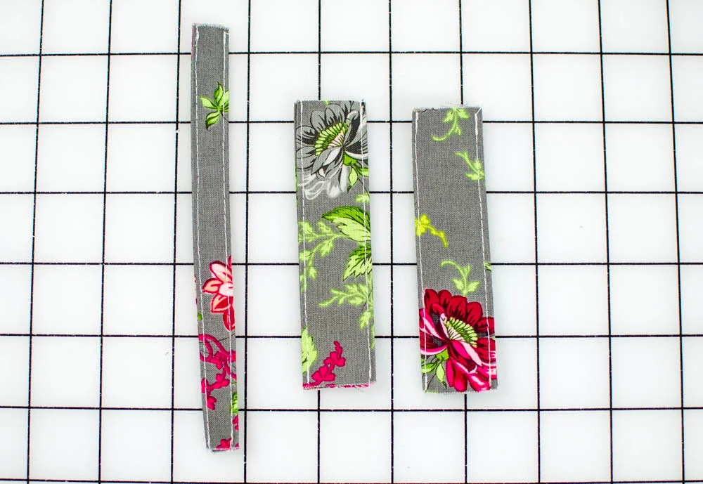 1. Press the 4” x 40” strip of fabric the same way that you pressed the button and D-ring loops.