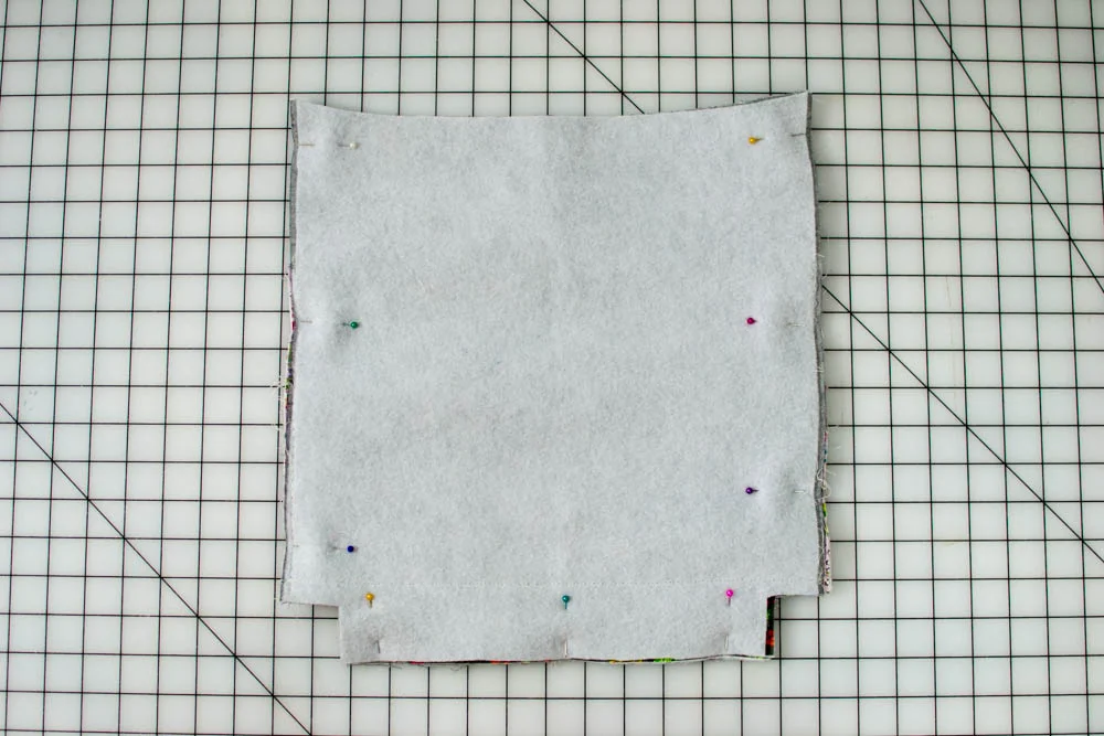 6. Place the completed pocket pieces on top of one of the bag exterior pieces, aligning the cut out corners at the bottom. Pin and baste together along the side edges.