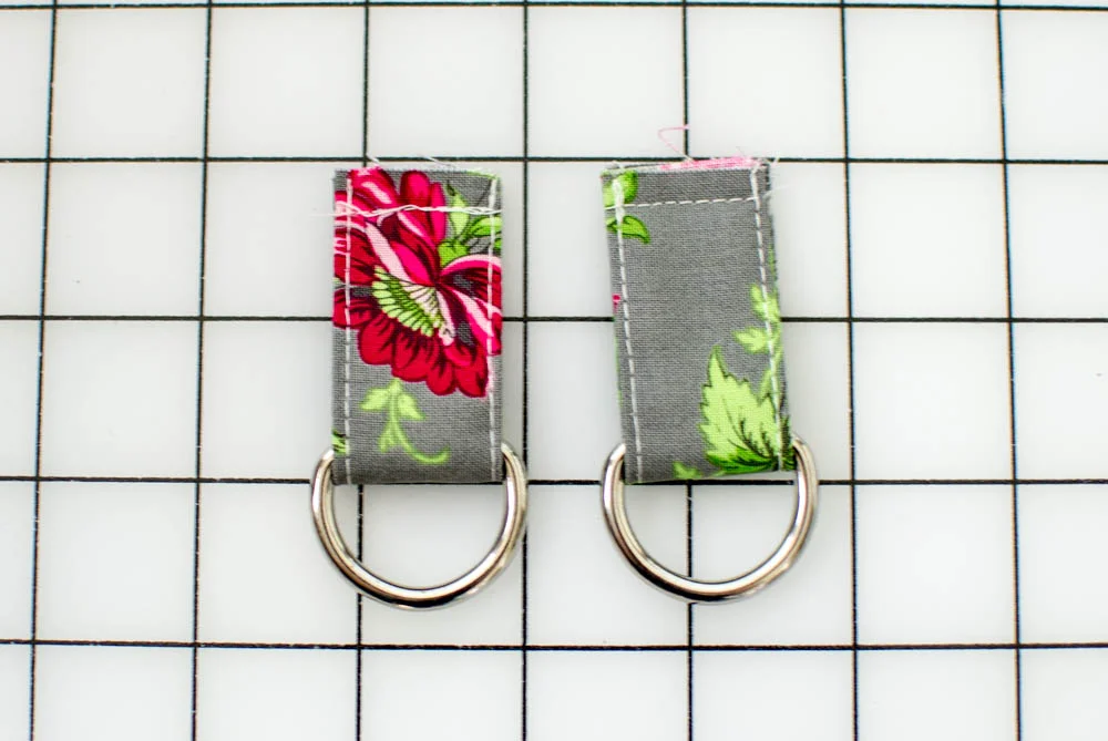 7. Wrap the D-ring loop pieces around the 1” D-rings and sew across the top edges. Set the two D-ring loop pieces aside for now.