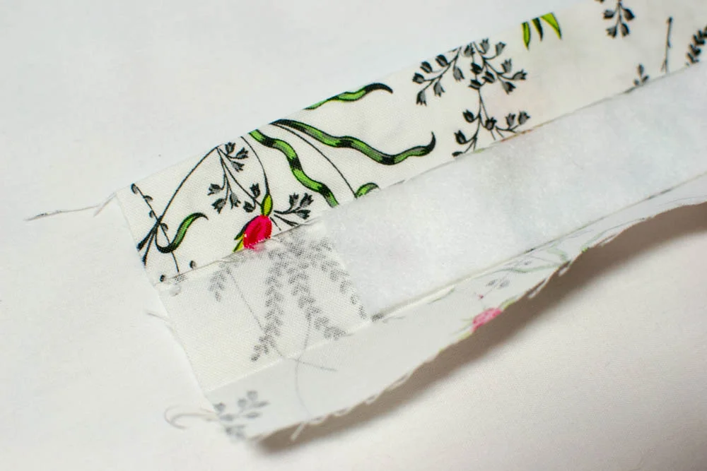 2. Insert the 1” x 37” strip of fusible fleece inside the folds of the strap piece. The fusible fleece strip is 3” shorter, so there will be an extra 1 1/2” bit without fleece at either end. Fold the strap together and press again.