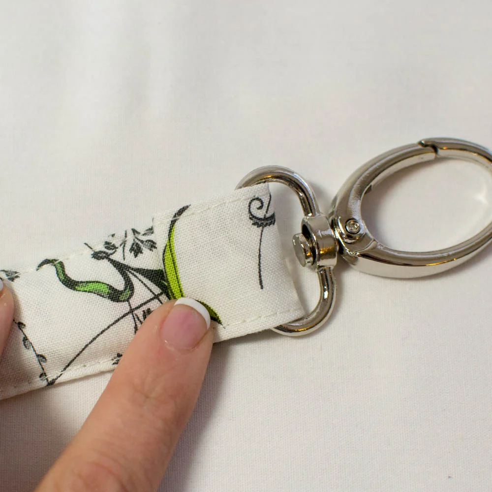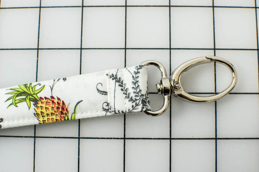 6. Stitch across the strap twice to secure the clip. Repeat with the other swivel snap clip at the other end of the strap.