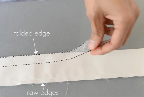 The bias strips will get pulled all the way over before ironing so that the bias strips are no longer visible on the side that they were initially sewn down onto. As you iron, the fusible tape that was applied earlier to the bias strips will now melt and adhere the strips in place.