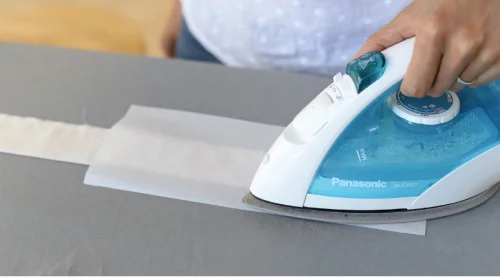 Once the corners are turned over, we’re going to iron our bias strips down onto the other side.