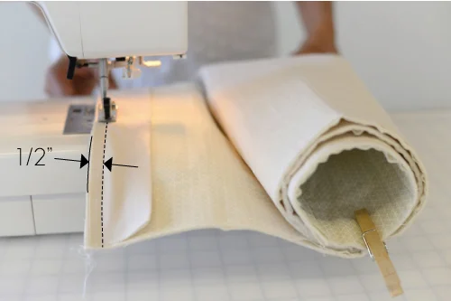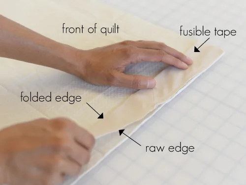 Lay down the bias strip with the fusible tape side face up, with the raw edges of the bias strip aligned to the raw edges of your quilt. Overhang your bias strips slightly so they extend a little past each corner of the quilt. Now sew the bias strip down onto the quilt, sewing ½” away from the raw edges.