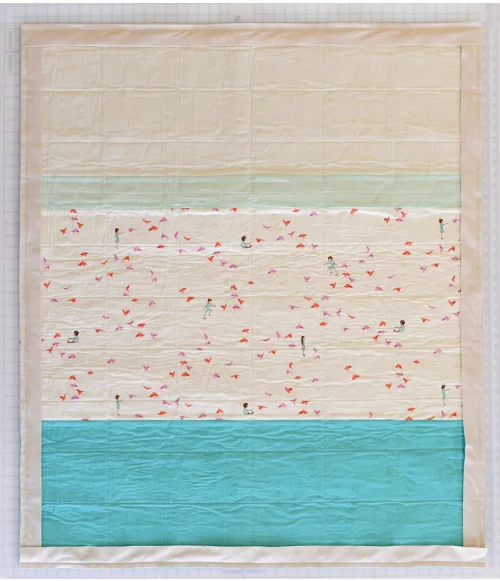 At this point, your strips are completely prepped, and we can move ahead with attaching the strips to the quilt. With the method we’re using, one side of your quilt will have the bias edging visible while the other side will not. With our quilt kits, we’ve chosen to have the bias edging visible on the back of our quilts, but you can select which face of the quilt you would like to have the bias visible. You’ll start by sewing your bias strips down onto the face of the quilt on which you do not want to have your bias visible. Lay this side of your quilt face up and lay one of your bias strips along oneof the quilt edges.
