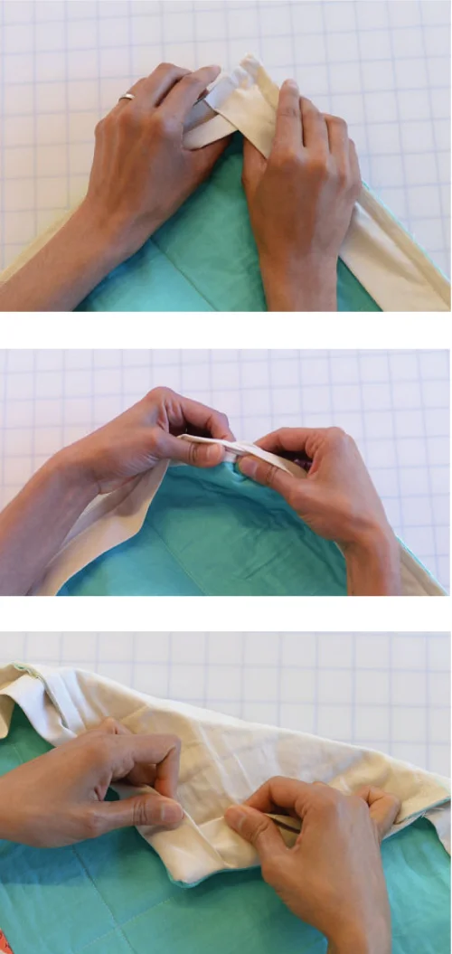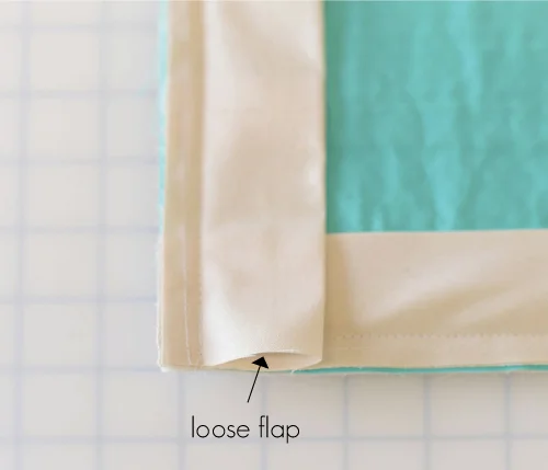 On each corner, we’ll sew the loose flap of bias tape down so the ends of the bias tape are all secured down.