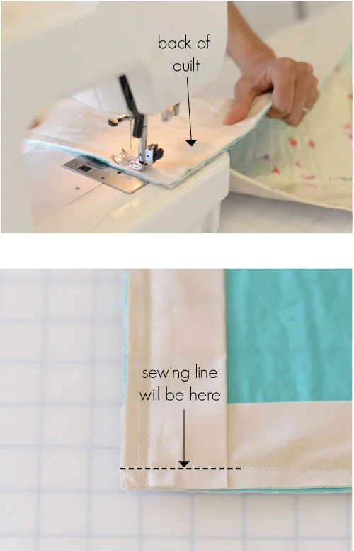 The hard part is now complete! With your bias strips attached securely to the quilt, all that’s left is to sew down your bias strips. Sew a small distance away from the folded edge of the bias strips.