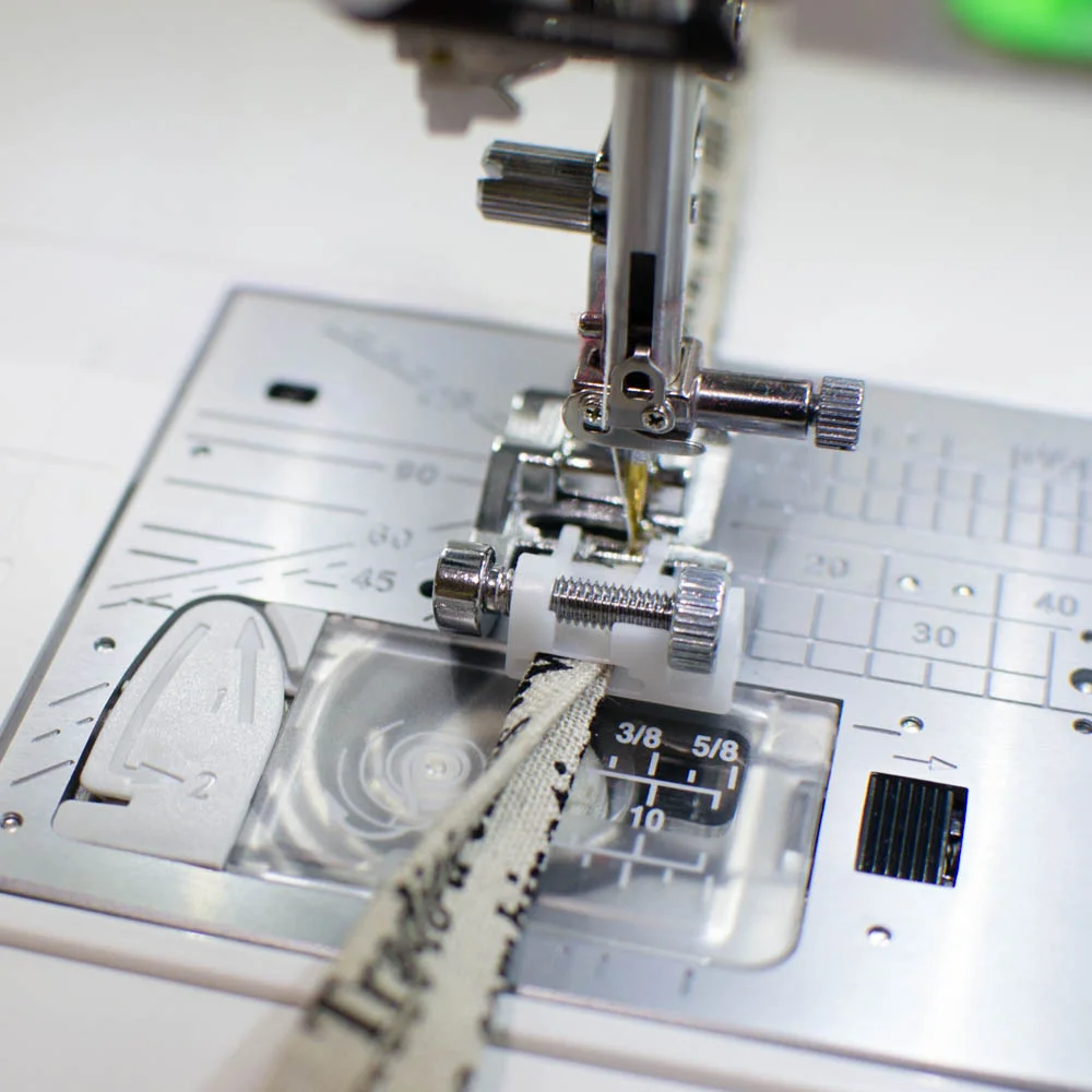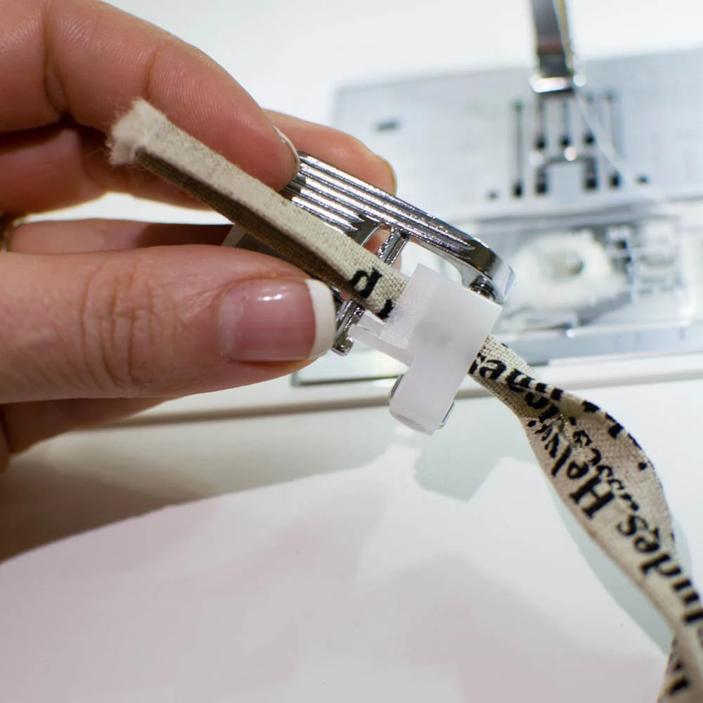 I threaded the 1” strip of fabric that is folded like double fold bias tape through the foot before I snapped the foot onto the foot holder on my machine. Then I positioned my needle all the way to the right.