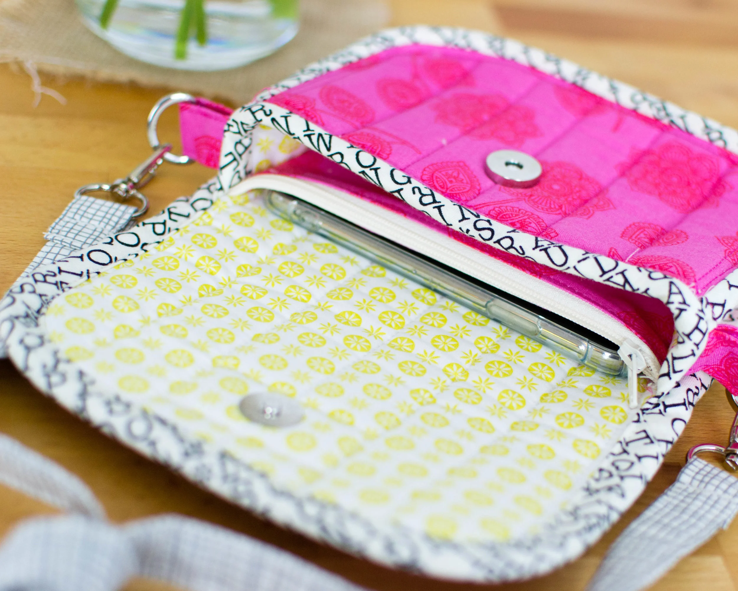 I’m so tired of carrying around a huge mom-purse! It is handy to have pens, sharpies, highlighters, 50 credit cards, 3 checkbooks, the last 6 Joann’s flyers, every receipt I’ve been handed in the past month, kleenex’s, hand lotion, body lotion, chapstick, 3 colors of lipstick, and more, plus my my phone with me wherever I go, but really? So I decided to sew myself a little clutch to hold just the essentials.