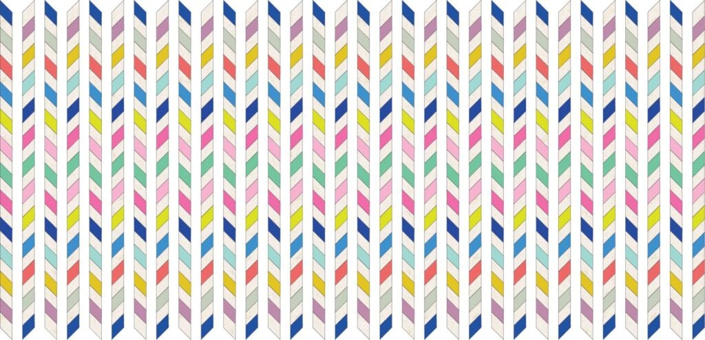 The gorgeous effect of falling confetti is achieved by strip piecing jelly roll strips with 2 1/2” wide strips of background fabric. The process entails sewing, cutting, and then sewing again. I’ll share a fun tip for achieving random placement of your fabric pieces. Even though the process is relatively simple, this might not be a particularly fast quilt to make.
