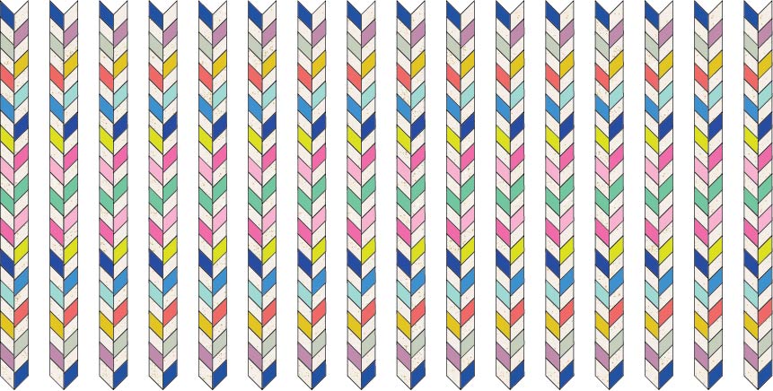 1. Arrange your 32 columns in an alternating pattern on a design wall or large bed. You may need to turn half of the columns 180 degrees so that the piece on top alternates between a background fabric piece and a print or colored fabric piece.