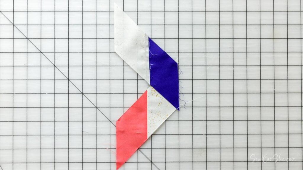 3. Now it’s time to work with the strips that were cut in the opposite direction. Place two pieces right sides together. The points should overlap by 1/4” at the top and bottom of the seam.