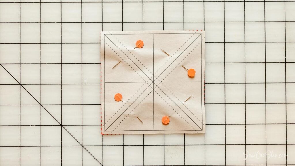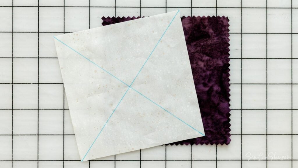 1. Use a pencil or fabric marking pen to draw two diagonal lines across the wrong side of a 5” square of background fabric. These are cutting lines.