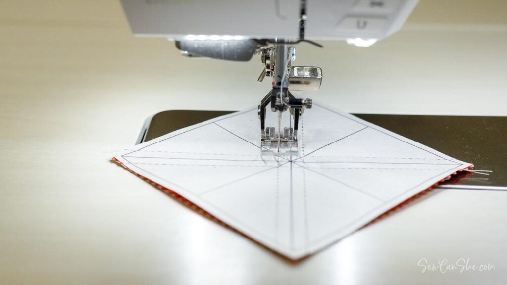 3. Sew along the 4 dashed lines on the paper. Use a short stitch length such as 1 or 1.5 to make tearing the paper away easier later.