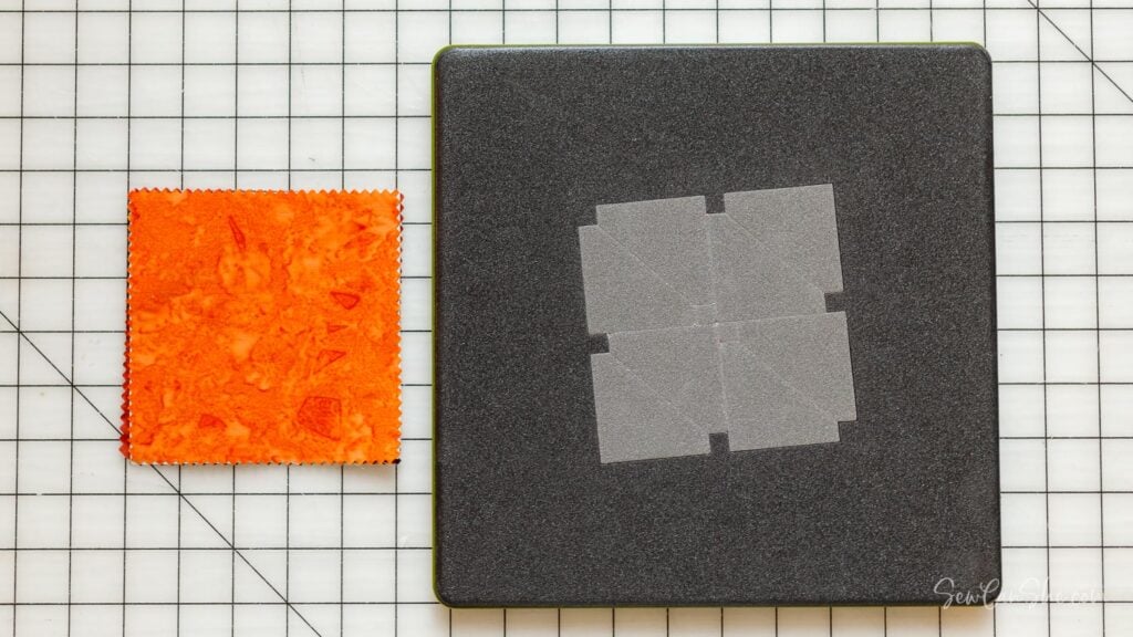 1. To use this die for this pattern, place 3 background fabric squares right sides together with 3 print fabric squares. Pile them up nicely and center the fabrics over the die. AccuQuilt suggests cutting larger squares of fabric to use with this die, so 5” squares require a little bit more effort to line all the layers of fabric up perfectly over the die lines.