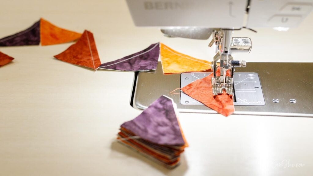 4. The triangle sets are already right sides together, so carefully stack them up and chain piece your heart out! Repeat until you have sewn all of the 16 print fabric 5” squares into half square triangles – 128 in all.