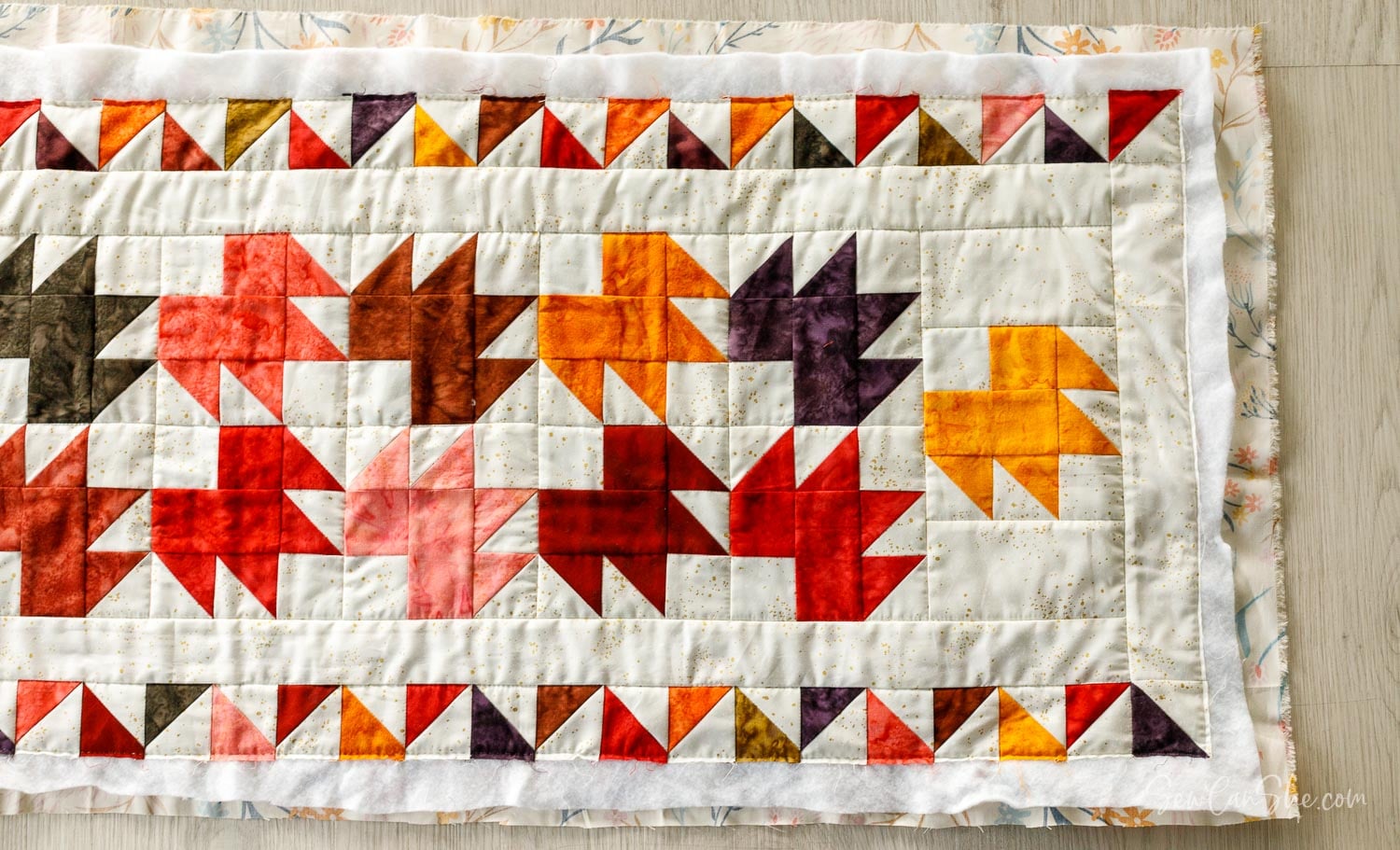 1. Make a quilt sandwich with the table runner top, the batting, and the backing piece.