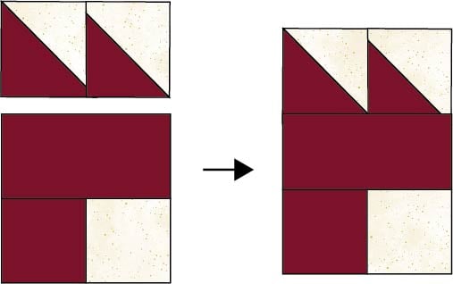 5. Sew the two HST units that are going ‘downhill’ to the top edge of the squares and rectangle that you sewed together in Steps 1-2.