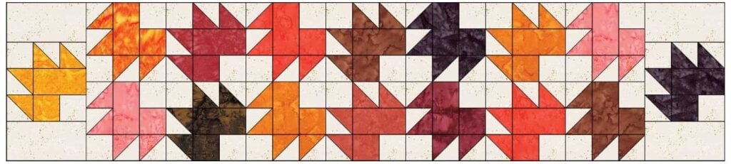 This free pattern includes instructions to make 4 1/2” (finished) Maple Leaf Quilt Blocks. You’ll make extra half square triangles to make festive sides for the runner.