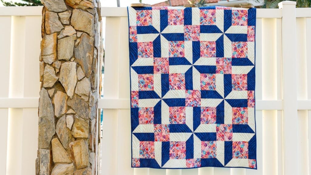 Make a delightfully fast and easy 3 Yard Quilt your next project! The Falling Spools 3 Yard Quilt pattern has just a single block to learn, but this block creates lots of movement on the quilt for a fun design that you’ll be proud to display in your home or gift to a loved one. Three yard quilts cost less to make because you don’t need a lot of materials, are often really quick to sew, and are easy to quilt on a home sewing machine.