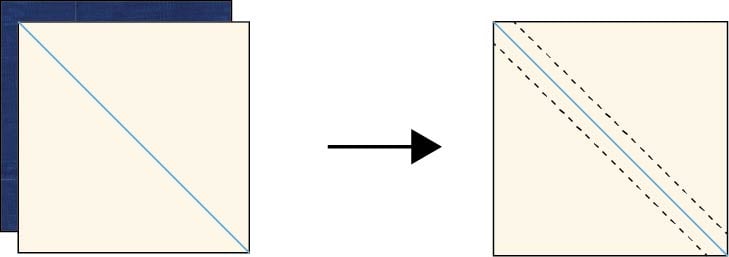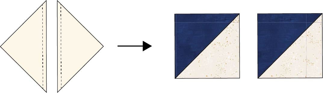 3. Cut each piece in half diagonally along the line. Open and press to make 2 half square triangles (HST units). Trim each HST to 3 1/2” square. Repeat to make 40 Fabric B/C HSTs.