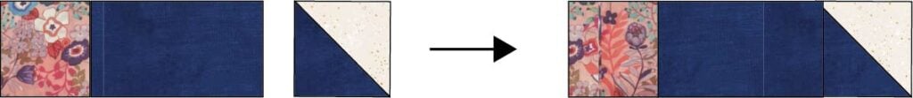 2. Sew a half square triangle to the opposite end of the Fabric B rectangle. Take note of the orientation of the half square triangle piece. Press the seam toward the HST.