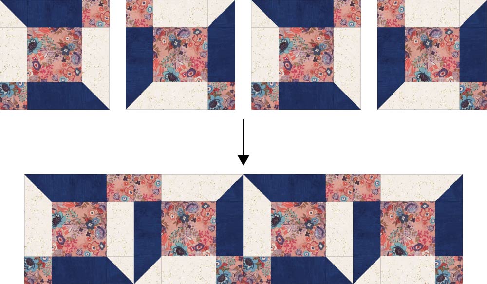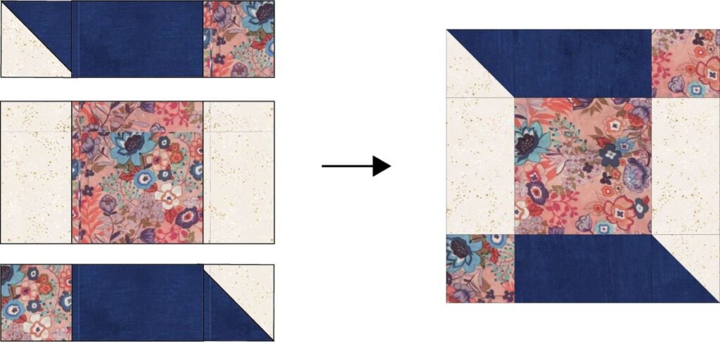4. Sew three block rows together as shown, noting the orientation of the top and bottom rows. Press the seams toward the center of the block.