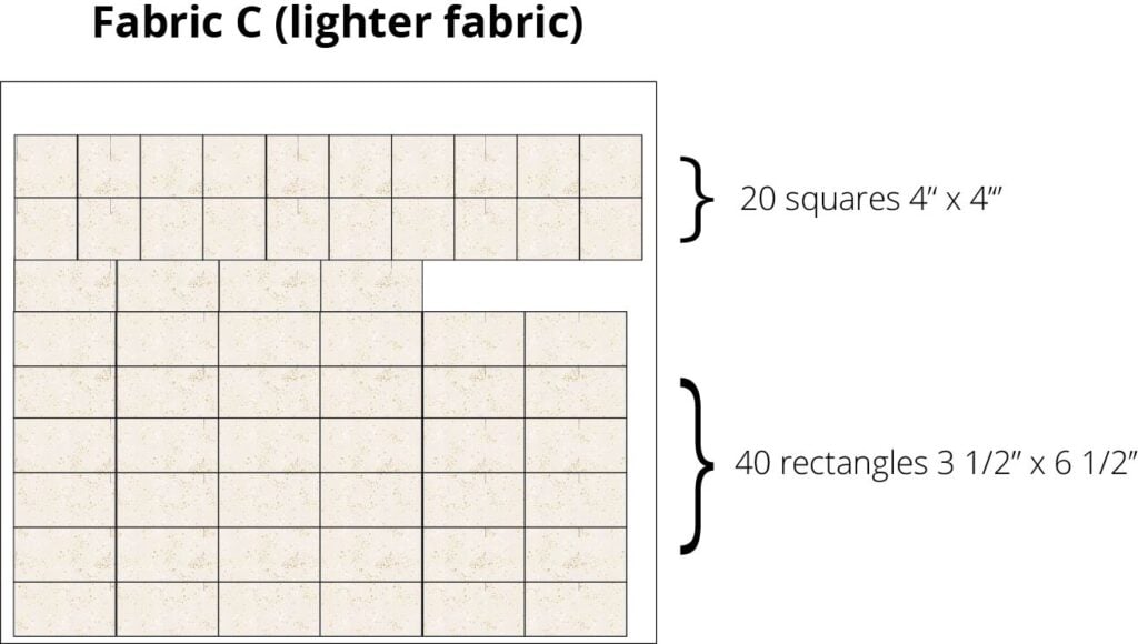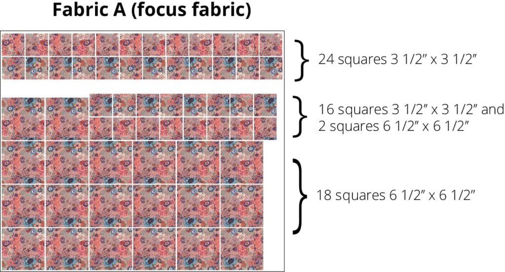 Important note: This pattern squeezes as much as possible out of each yard of fabric. The width of the main focus fabric must have 42” of usable fabric. Most fabric printed in the last 5-10 years will work great because it’s 44” wide, including the selvages so it is 42-43” wide after you cut off the selvage. Please measure the length and width of your fabric pieces before getting started to make sure and follow the cutting charts below carefully.