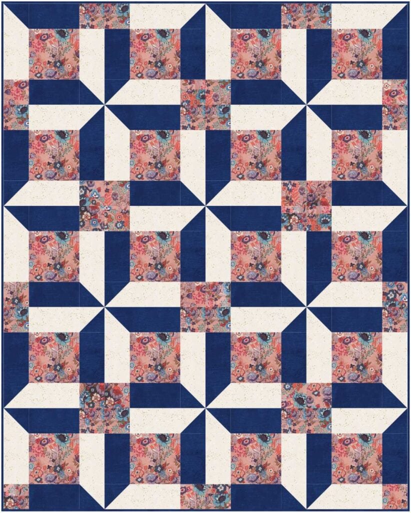 Your Falling Spools Quilt will finish at 48” x 60”, which is a great throw quilt size. This quilt pattern is perfect for showcasing your favorite large scale prints because of the big 6” piece in the center of the blocks.