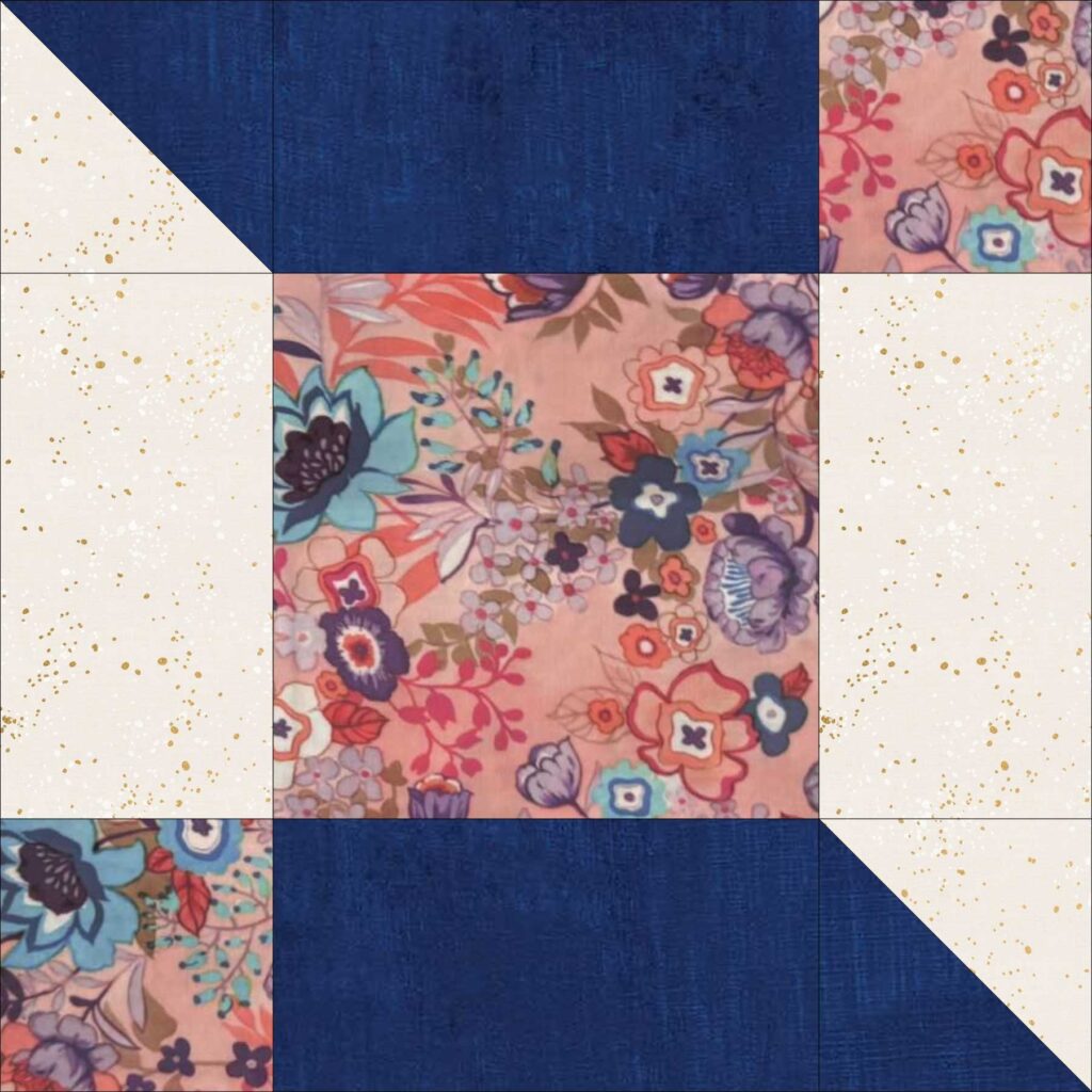 This quilt pattern includes a single ‘Falling Spools’ quilt block. Your main ‘focus fabric’ in the center can make the blocks really pop, and the coordinating or darker fabric will make a secondary pinweel pattern in the background. Feel free to fussy cut a 6 1/2” square for the center of the blocks, but keep in mind that half of the blocks will be rotated a quarter-turn to the left.