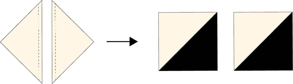 3. Cut the half square triangles apart along the drawn line. Press each one open and trim to 4 1/2’’ square.