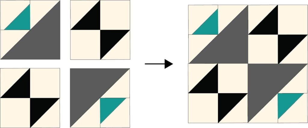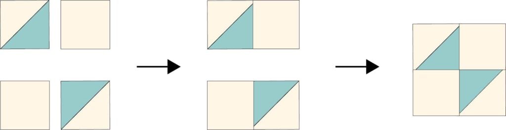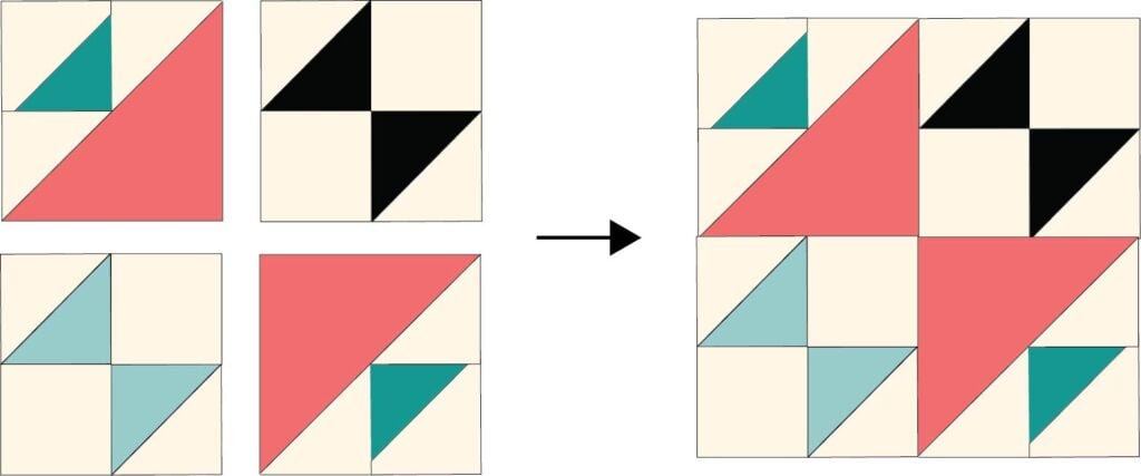 1. Arrange two 4 1/2” squares and two matching half square triangles as shown. Sew each half square triangle to a background square. Press. Then sew the two pieces together to make an 8 1/2” square hourglass block and press.