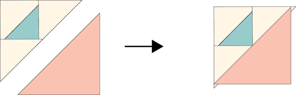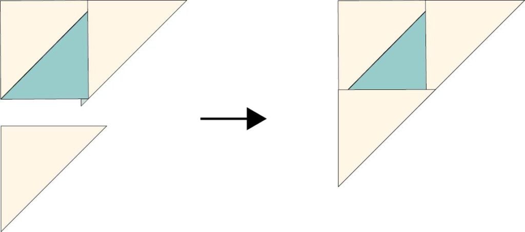 3. Sew a background fabric triangle to the lower edge of the half square triangle piece, as shown. Press.