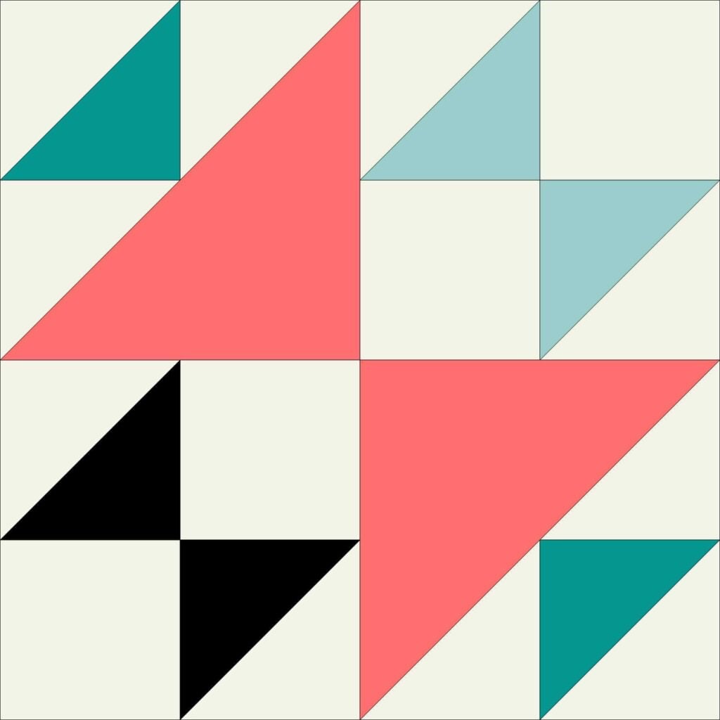 This easy quilt block design has hourglass shapes made with half square triangle pieces. Another name for this block is old maid’s puzzle.