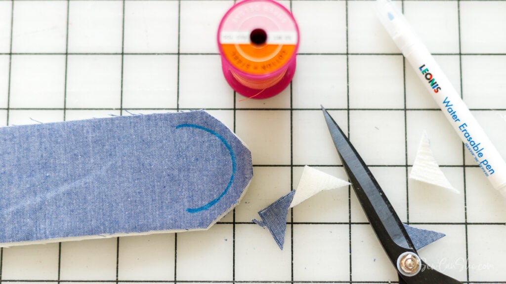 5. Remove the spool and trim away the corner of the interfacing 1/4” away from the drawn curved line. Don’t worry about cutting a smooth edge yet. This is just to remove some extra fabric and interfacing to make sewing easier.