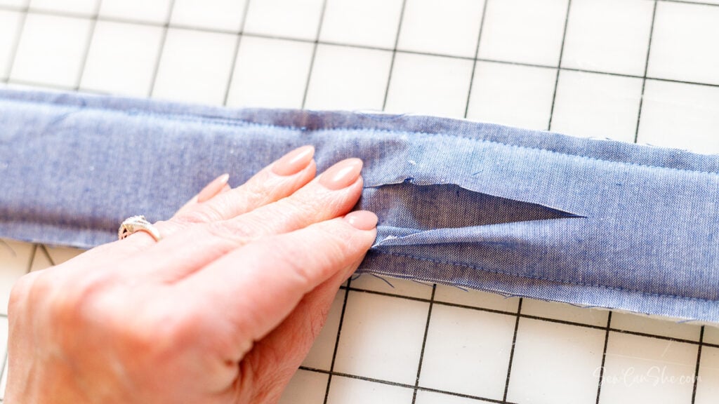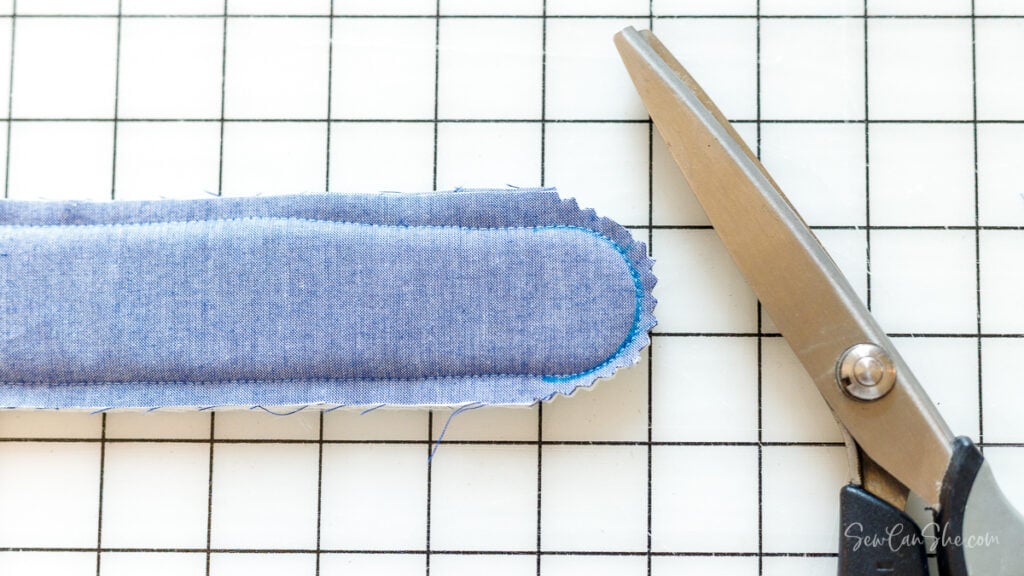 2. Now trim away extra fabric and interfacing 1/4” away from the stitching at the ends. Use scissors or pinking shears to cut notches around the curves to make turning easier.
