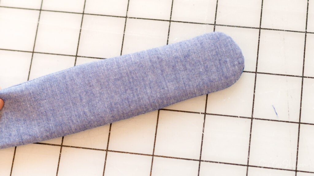 4. Use a regular sized spool of thread to draw a half-circle curve at each end of the strap, on the wrong side of the fabric. The edge of the curve should be 1/4” away from 3 edges of the strap, as shown.