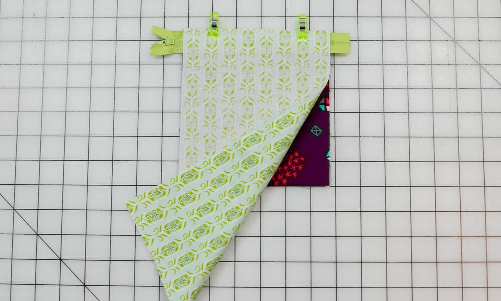 6. On the back, fold the pocket lining up and align the bottom edge with the top edge of the zipper.