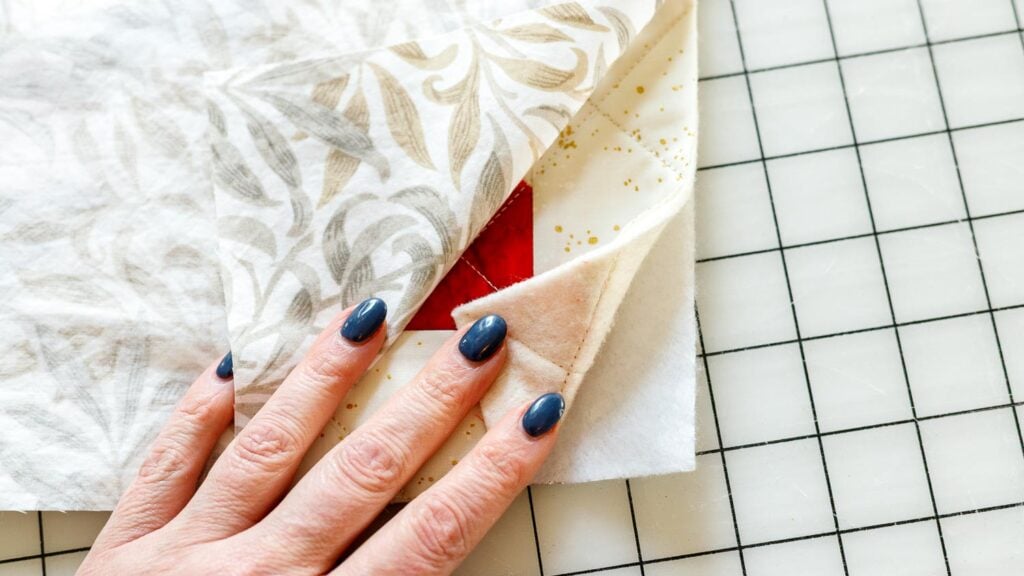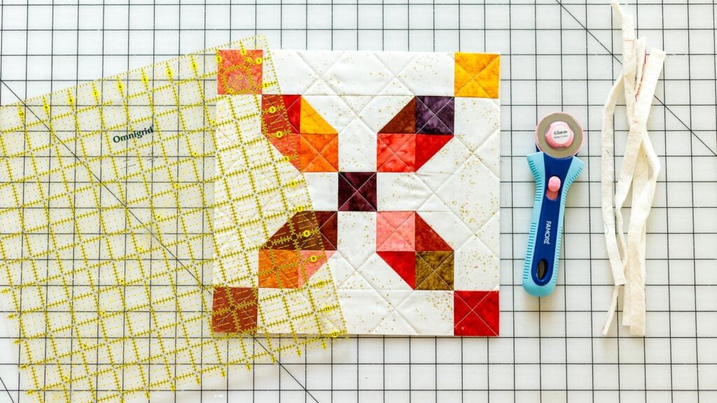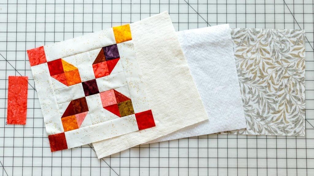 3. Trim around the block to make it the same size as your insulated batting and backing fabric.