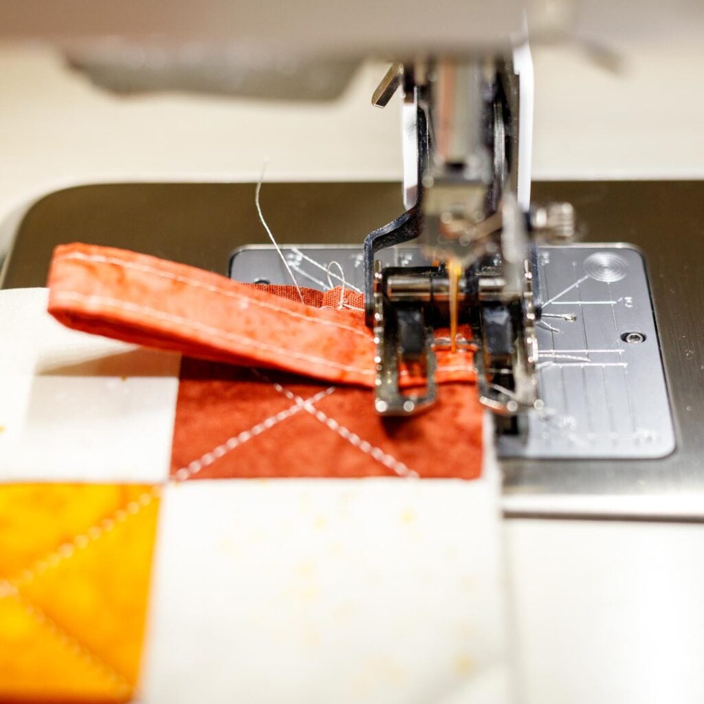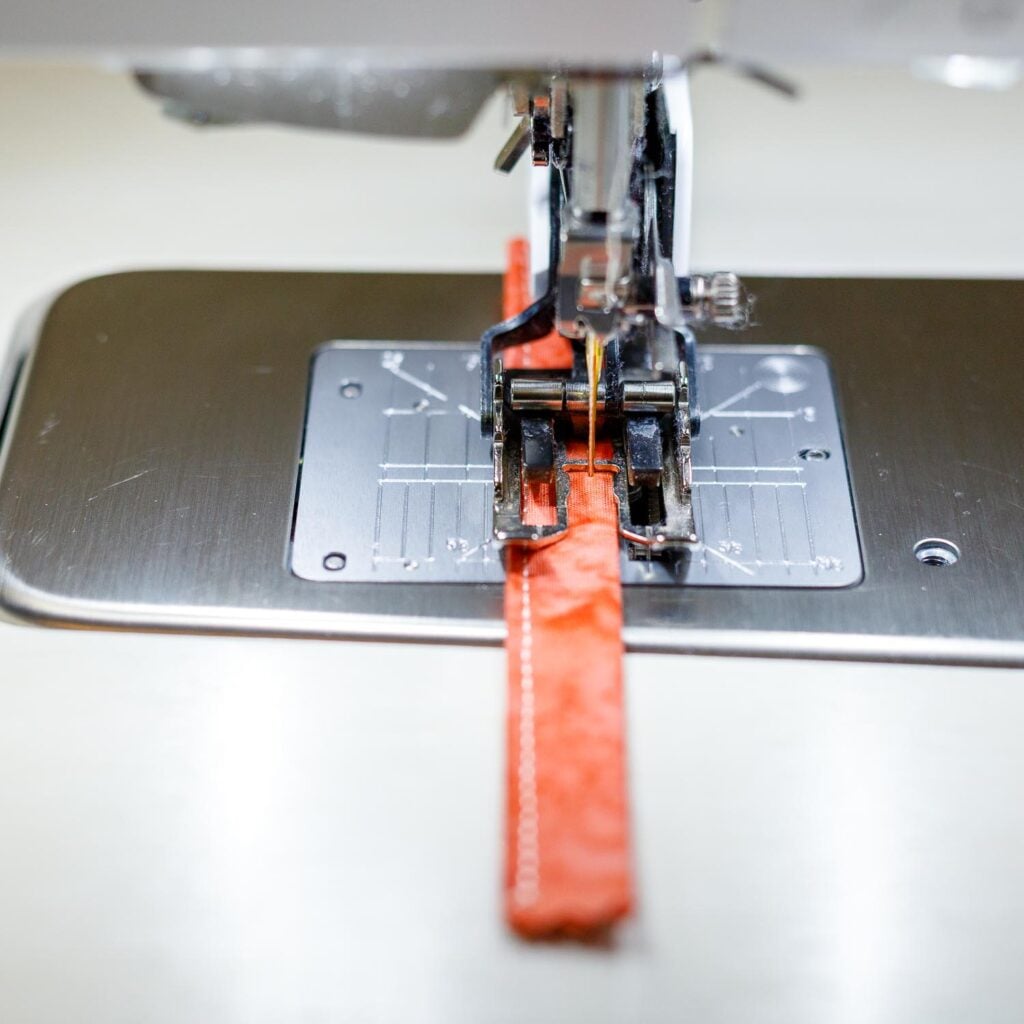 1. Fold the 2’’ x 5’’ fabric piece in half lengthwise and press. Open and fold the long edges to the center and press. Then fold it in half again to make a 1/2’’ x 5’’ piece. Topstitch 1/8’’ away from both long edges.