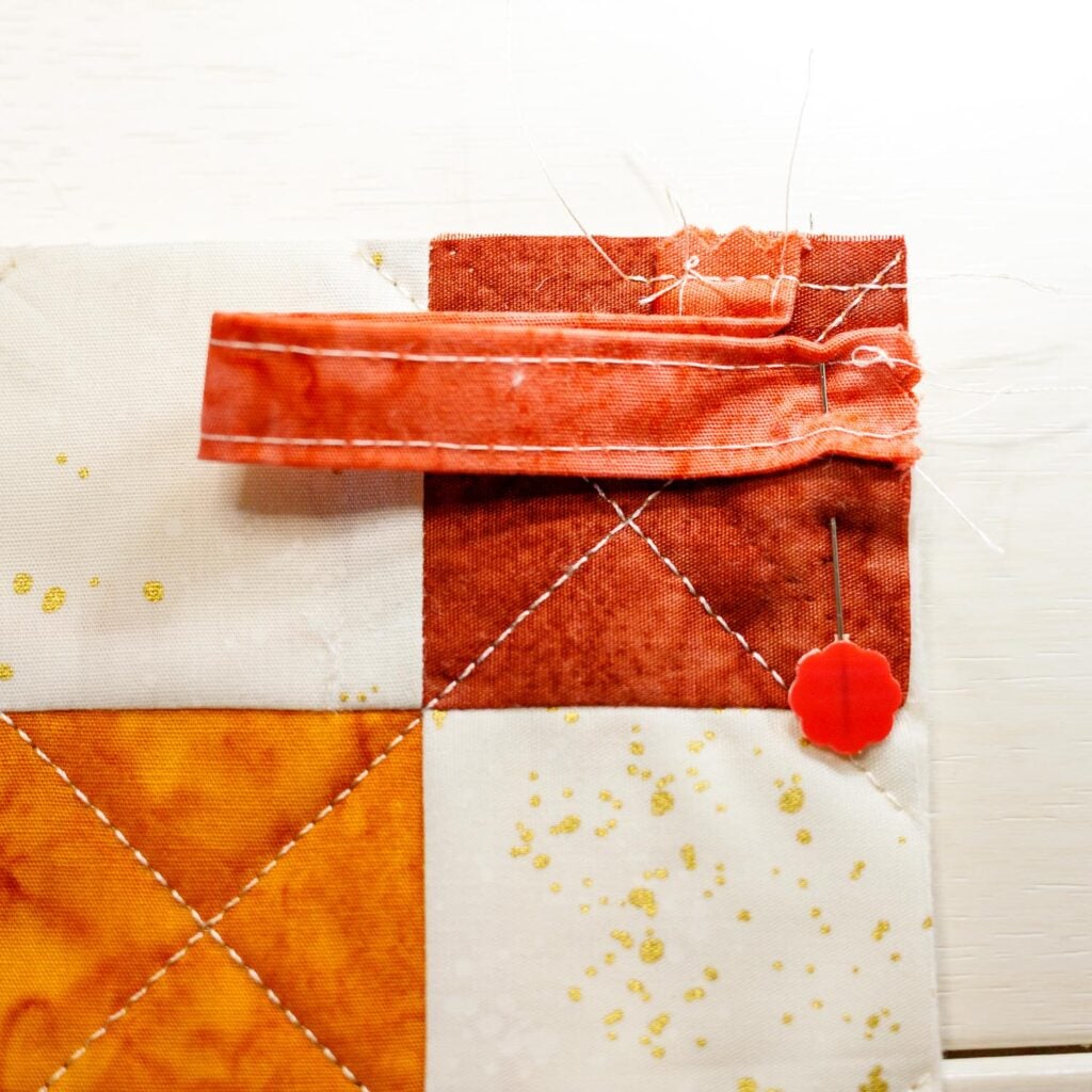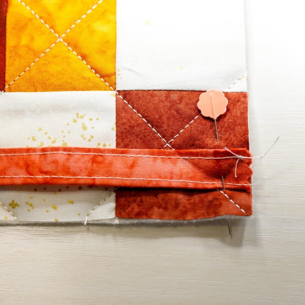 3. Remove from your sewing machine and pin the opposite end of the strip to the adjacent edge, also 3/8’’ from the corner, as shown.