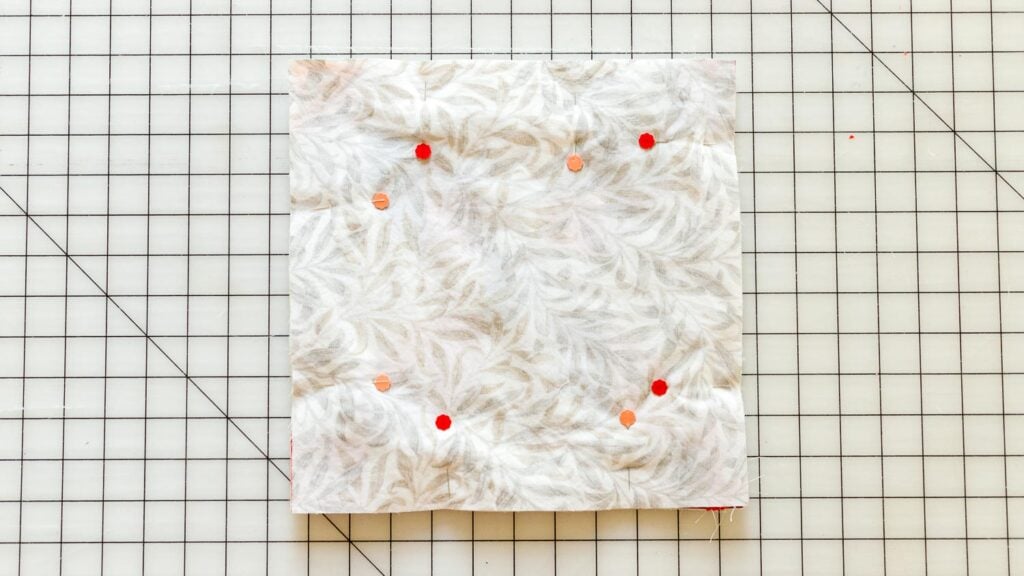 1. Use a pencil, pen, or fabric pen to draw a diagonal line across the back of all of the background fabric 2 1/2’’ squares. This is a cutting line – not a sewing line.