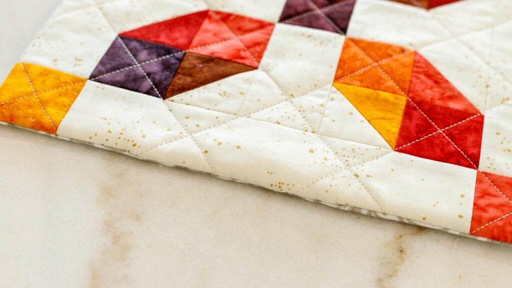 When sewing this table trivet, you’ll learn a shortcut method for making 2 half square triangles at a time. The finished size is approximately 10 1/2’’ x 10 1/2’’ perfect for placing under a large pot! There is a hanging loop attached to one corner.