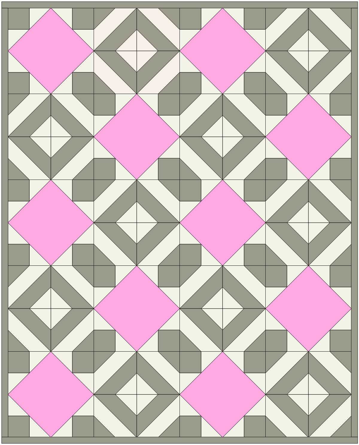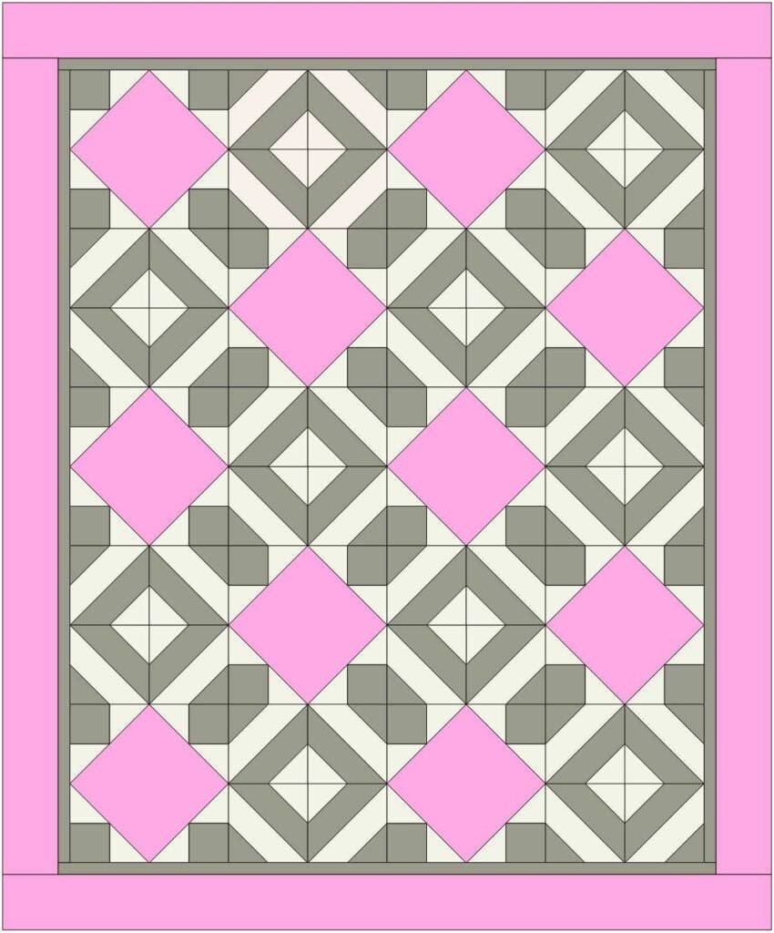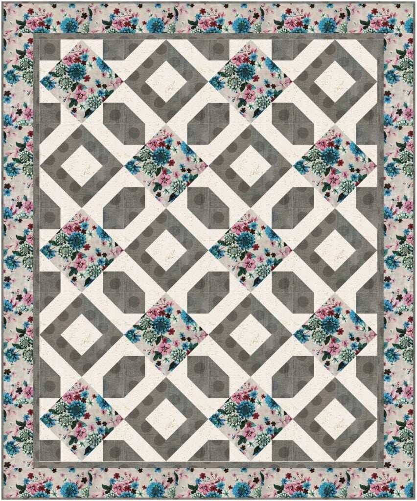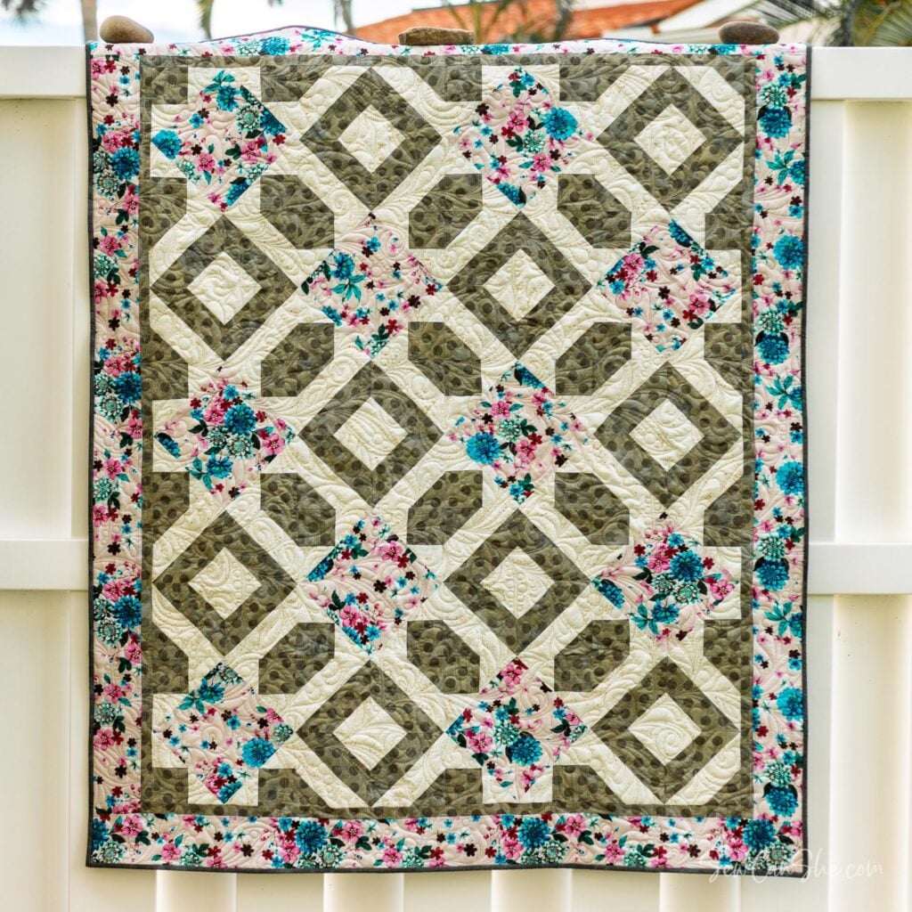 Sew a beautiful throw quilt reminiscent of stepping stones in a park! This free quilt pattern requires just three 1-yard cuts of fabric and I’ll show you how to pick three that will coordinate perfectly. The large squares set on-point are perfect for featuring a beautiful large print that will also shine on the border.