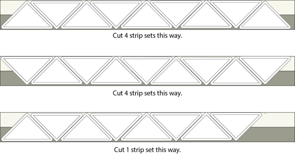 Tip: The triangle template is 4 1/8” tall. Use a ruler and rotary cutter to trim off the top 1/8” of the triangle template so that it is exactly 4” tall – the same size as your strip sets.