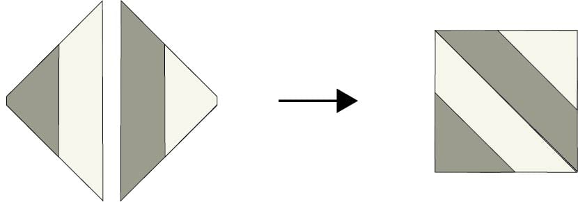 1. Select one triangle with a wide strip of Fabric B and one triangle with a wide strip of Fabric C. Sew the pieces together along the long edge. Press.